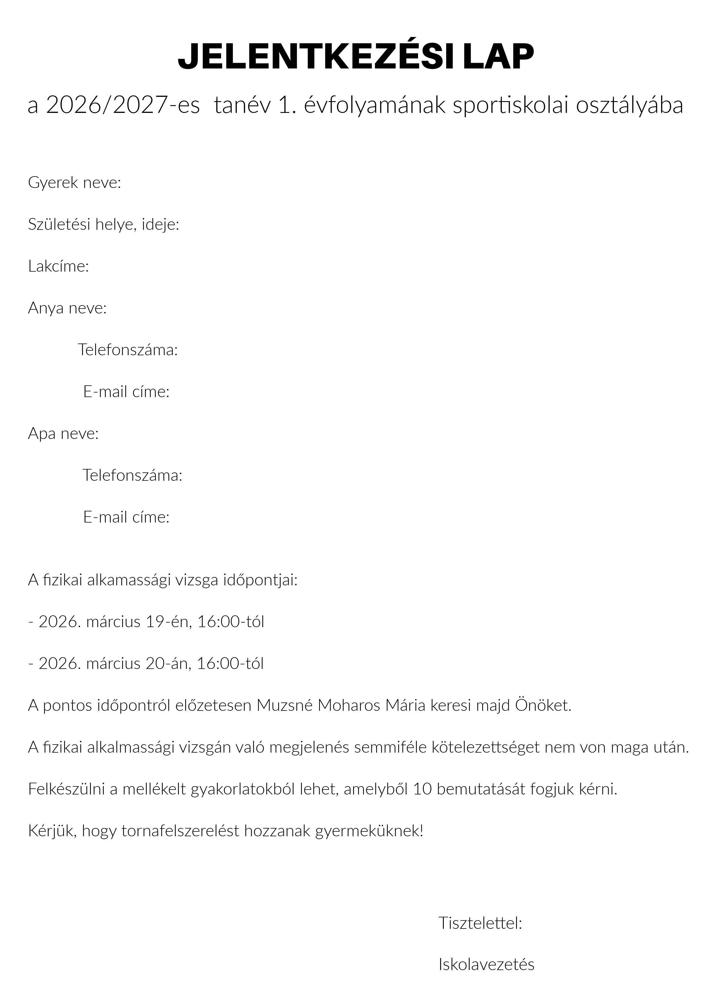 Jelentkezési lap a 2025/26-os tanév 1. évfolyamának sportiskolai osztályába